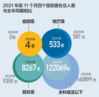 2021年1-11月,查处省部级4人,地厅级 533人,县处级8267人,乡科级及以下122069人,反映出各级纪检监察机关层层传导压力,严格执纪,推动各级党员领导干部落实中央八项规定精神。