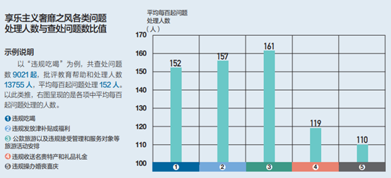 “违规吃喝”“违规发放津补贴或福利”“公款旅游以及违规接受管理和服务对象等旅游活动安排”这些问题查处人数多,说明特点为群体违纪,涉及面大。“违规收送名贵特产和礼品礼金”“违规操办婚丧喜庆”这些问题查处人数较少,一般都是“一对一”“个对个”,涉及面小。